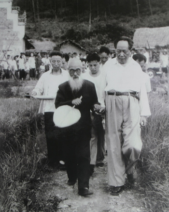 毛主席与儿时的私塾老师携手走在乡间小路上