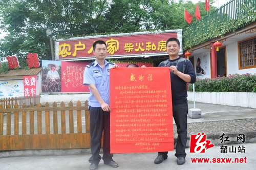 韶山新闻网讯(文丽 莫正德) 4月26日,陕西游客刘友安在韶山一饭店吃完中饭后,不慎将价值三万多元的相机遗留在饭店,在清溪派出所民警的帮助下,第二天刘友安重返韶山从该饭店拿回了相机。5月8日,不胜感激的刘友安从陕西寄来了感谢信和锦旗。