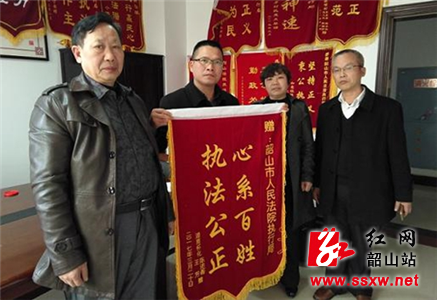 韶山新闻网讯(余拙 陈艳梅) 3月20日,受申请执行人陈某、王某的委托,其代理人为韶山法院执行局送来“心系百姓、执法公正”的锦旗。