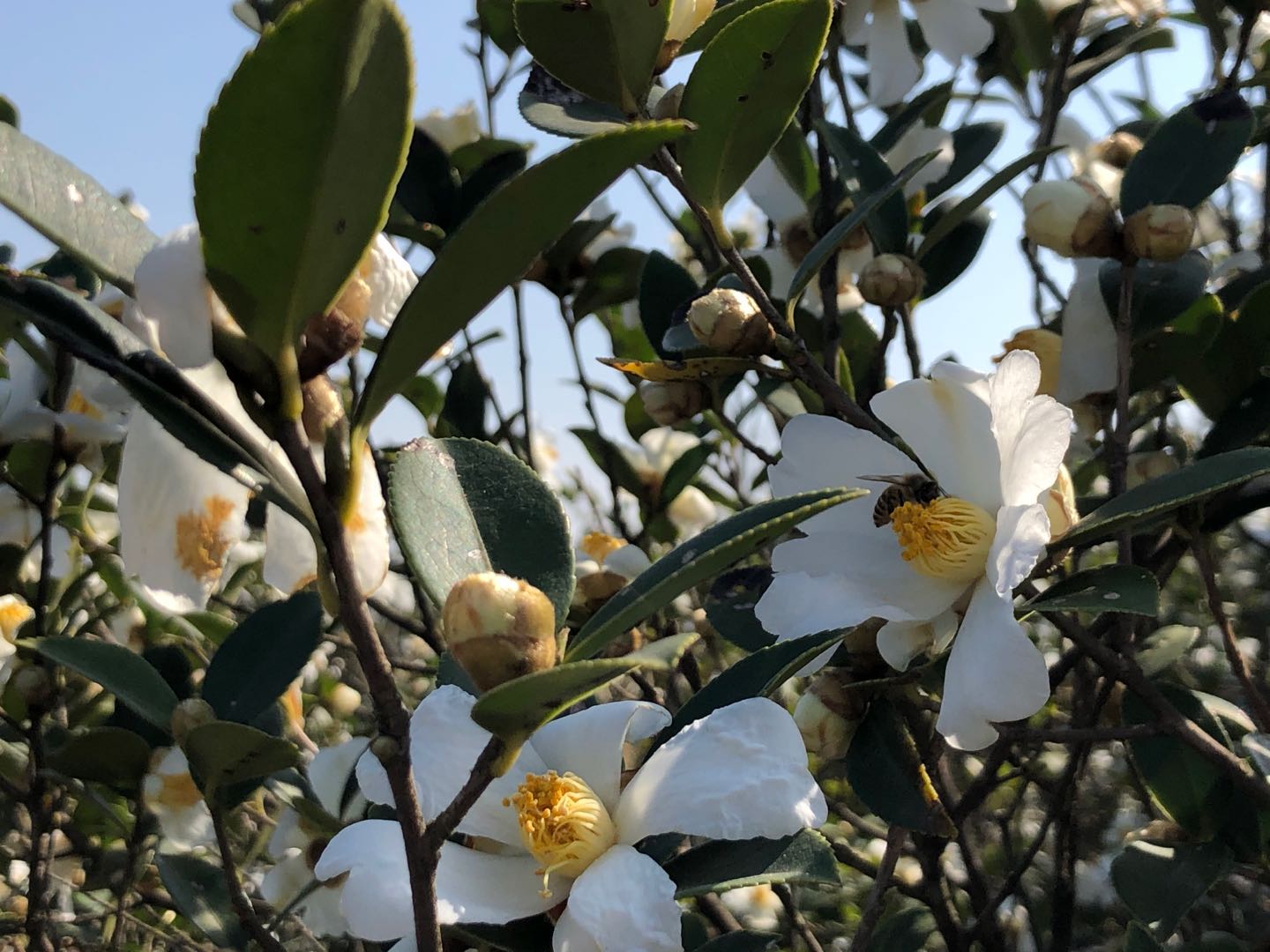 走进油茶林记者看到,层层叠叠的油茶花顺着地势蜿蜒延伸,绽放盛开。洁白的花瓣,金黄的花蕊,团团簇簇、层层叠叠,在蓝天的映衬下更加夺目。清风拂过,油茶花随风摇曳,飘来阵阵清香。