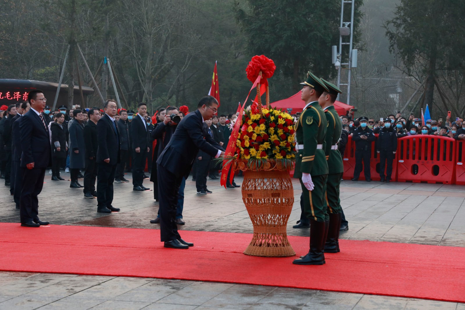 伴随着深情的《献花曲》响起,武警缓缓抬起花篮,迈着稳健的步伐走到毛泽东同志铜像前,将花篮轻轻放下。现场所有人缓缓向铜像三鞠躬,寄托对毛主席的无限敬仰和无尽思念之情。
